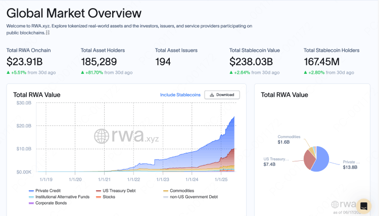 现实世界资产(RWA)的代币化已经成为区块链行业最引人注目的主题之一。目前,以太坊在RWA市场中仍然占据主导地位,而像Solana这样在DeFi领域已经相当成熟的平台,也开始向RWA领域扩展。数据显示,截至2025年6月17日,链上RWA的总价值已经超过238亿美元(不包括稳定币)。这些资产中,私人信贷占138亿美元,美国国债占74亿美元,大宗商品占16亿美元。