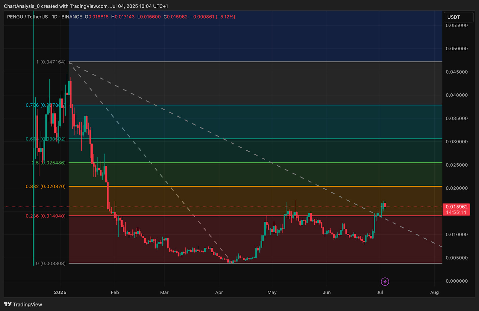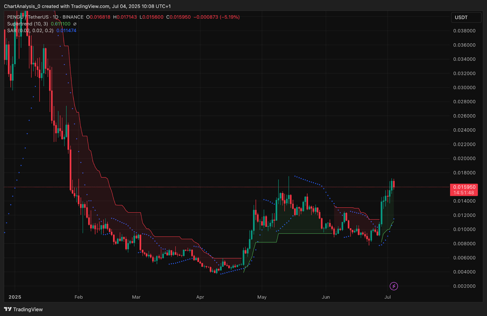 在从数月盘整的水平大幅反弹后,Pudgy Penguins (PENGU)在日线和周线图上都发出了强劲的看涨信号。目前,价格走势正在挑战关键阻力位,交易员们正在评估当前的突破能否演变为长期趋势的转变。