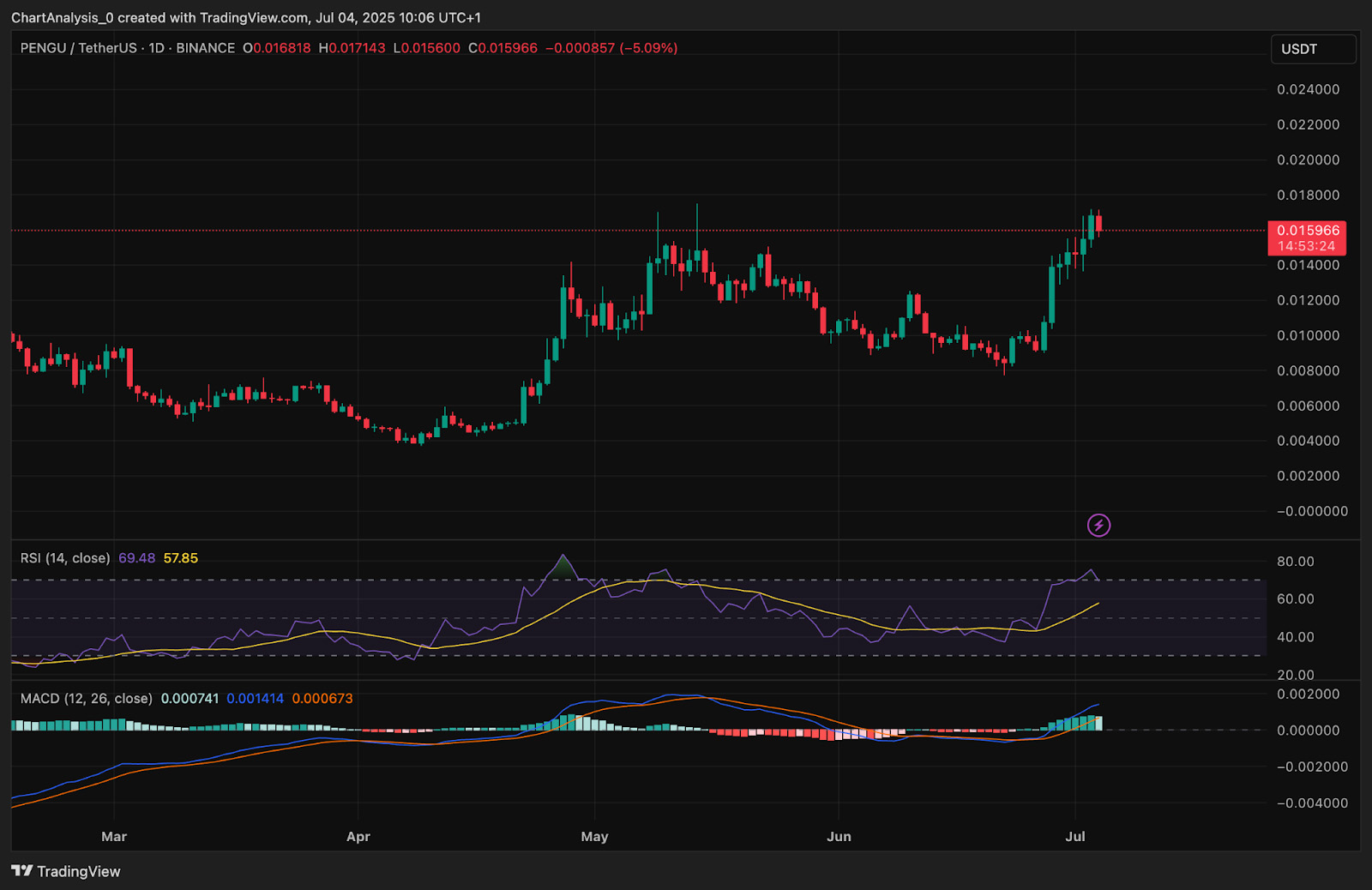 答:PENGU目前技术面表现强劲,已突破下行趋势线,RSI位于69上方显示超买但动能强劲,MACD呈现看涨交叉,价格高于所有主要EMA,超级趋势已转为看涨,整体技术面达到一年多来的最强水平。 - 问:PENGU目前面临的关键阻力位在哪里?