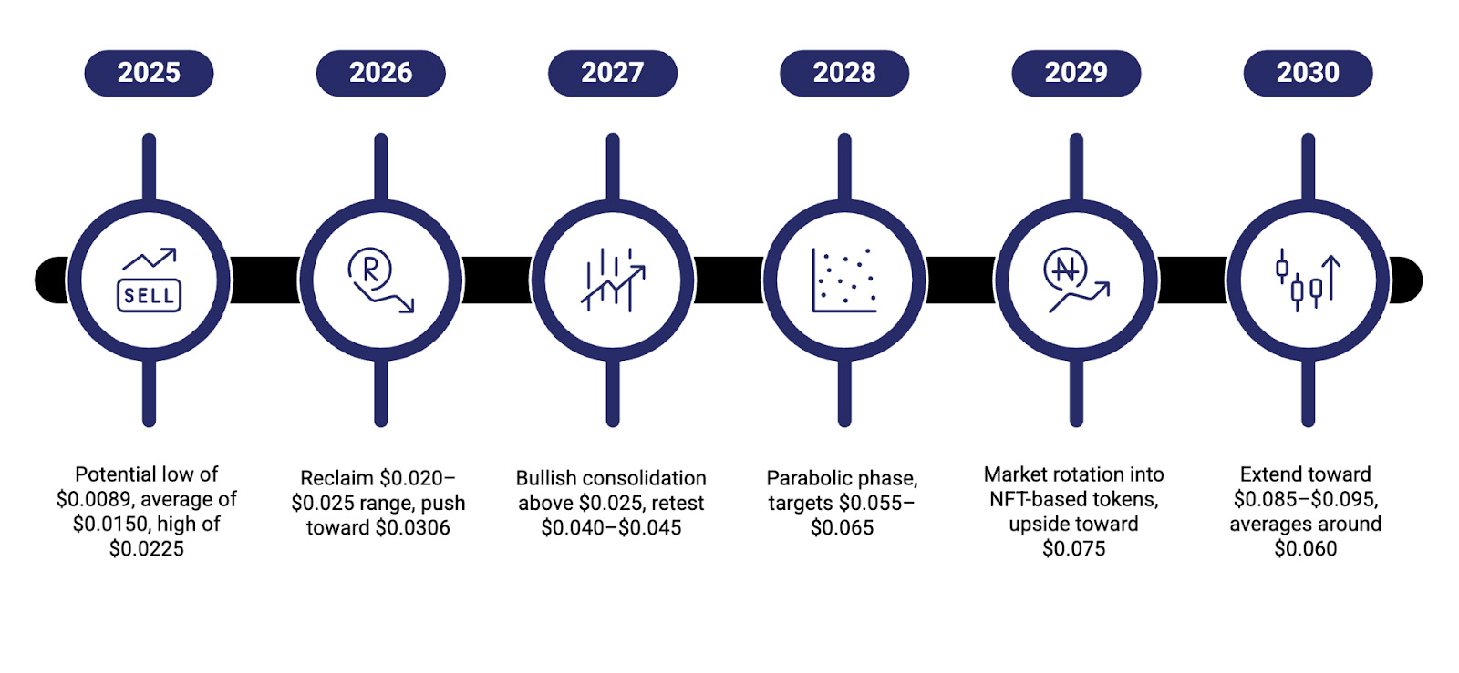 到2026年,如果该资产价格回升至0.020美元至0.025美元区间且成交量强劲,则可能推升至0.0306美元(斐波那契回撤位0.618)区域。0.0150美元上方的结构性支撑位可能会吸引逢低吸纳的买家。如果NFT市场恢复活力,到年底可能触及0.034美元附近的高点。