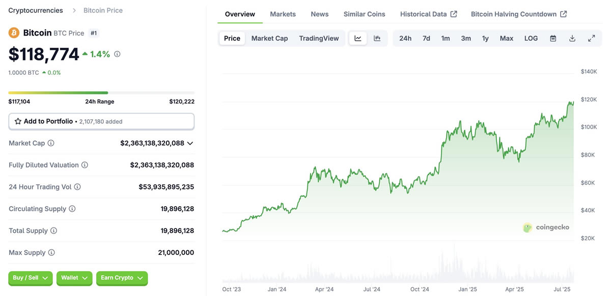 截至2025年7月中旬,所有在美国上市的现货比特币ETF累计净流入总额已经超过了547.5亿美元。据Cointelegraph统计,这些ETF的总资产管理规模达到了约1524亿美元,占当时比特币总市值的6.5%左右。