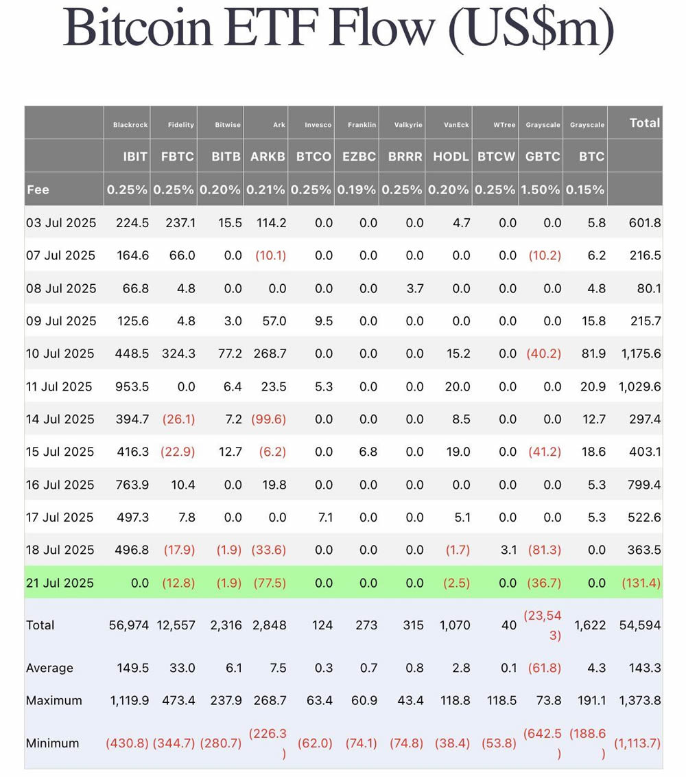 另一个有力的证据来自Farside Investors,该公司追踪了ETF发行机构的每日资金流动情况。例如,2025年7月10日和11日,贝莱德的IBIT、富达的FBTC、Bitwise的BITB和ARKB等发行机构的每日资金流入总额分别超过11.8亿美元和10.3亿美元。有趣的是,这两天恰好与比特币接近历史最高价位的时间点重合,这表明资本流入与价格飙升之间存在紧密的关联。