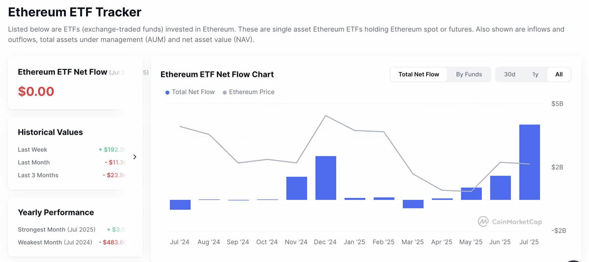 更令人瞩目的是比特币在2025年的表现。截至7月中旬,比特币价格已经突破12.3万美元,自同年4月以来上涨了近65%。MarketWatch报道称,仅2025年一年,ETF流入就达到了148亿美元,这清楚地表明机构需求已经超越了以往由散户主导的市场周期。一个特别引人注目的例子是,当某一天ETF吸引了11.8亿美元的资金流入时,比特币价格应声飙升至11.8万美元以上,引发了空头回补潮,进一步加速了价格上涨。