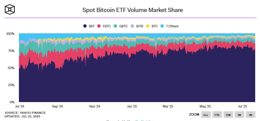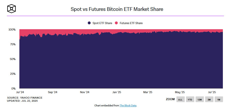 从市场结构来看,ETF目前在现货交易量中已经占据主导地位。The Block的数据显示,到2025年中期,美国现货比特币ETF的总交易量已经超过1万亿美元。这一惊人的交易量不仅反映了市场的成熟度,也体现了传统金融体系对比特币的接受程度正在不断提高。