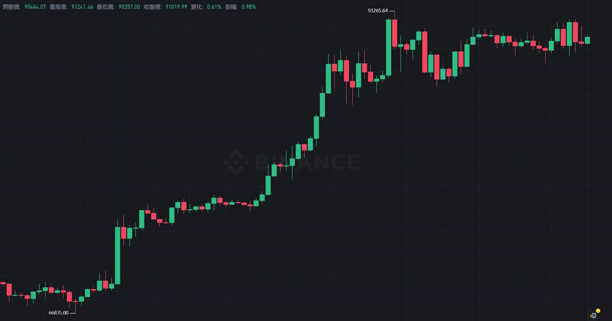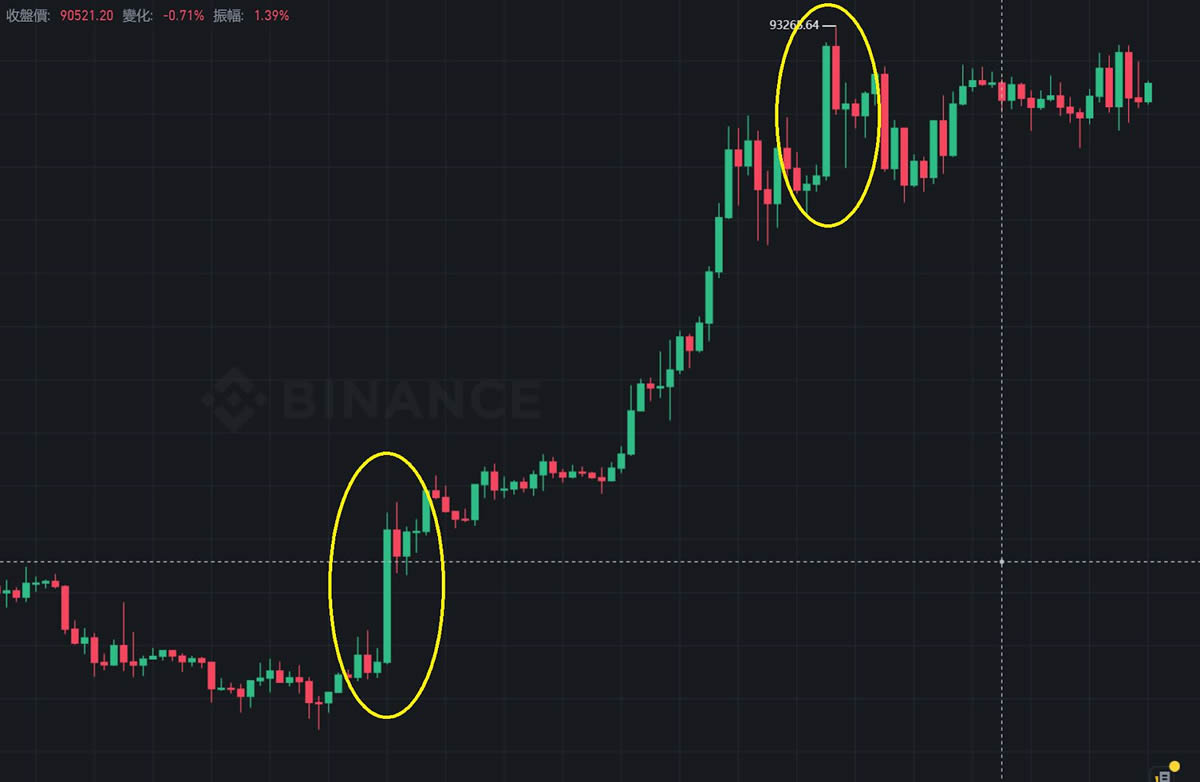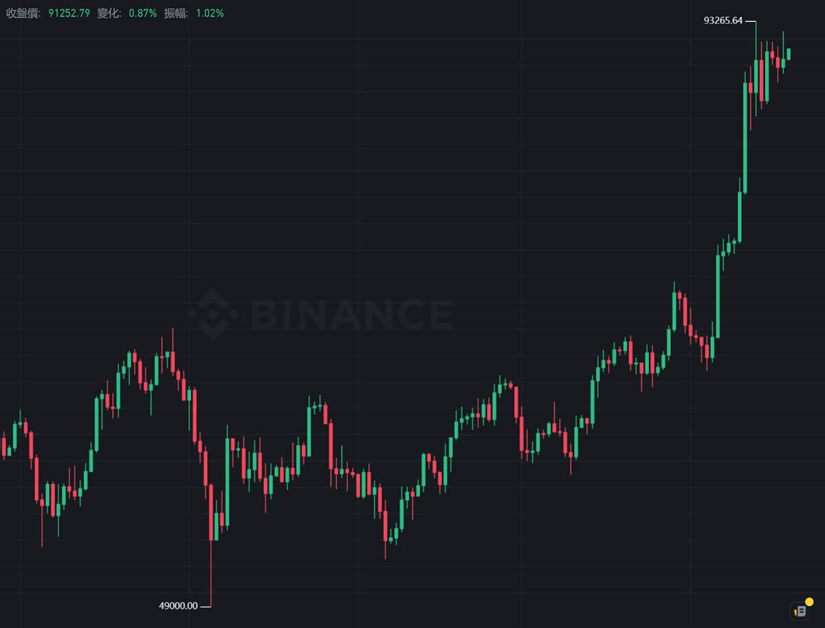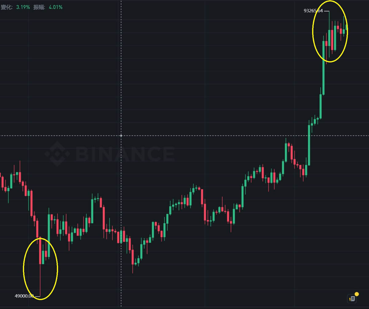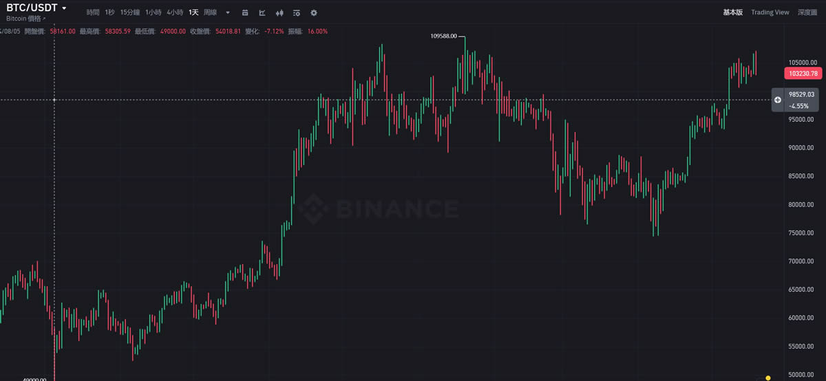下图展示的是币安交易所比特币的K线图,每根K线代表四小时内的价格变化。通过观察这些K线的排列和变化,我们可以判断市场当前的趋势——是处于上涨、下跌还是盘整状态。