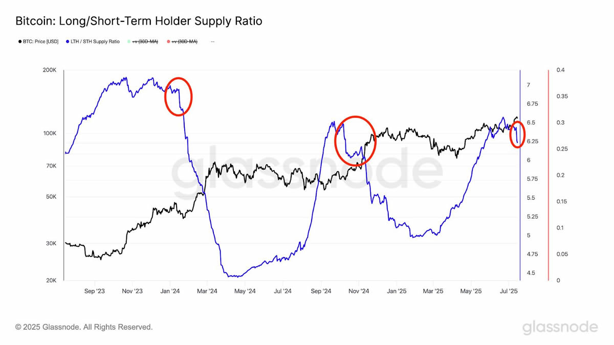 另外,虽然如上所述,长期持有者的抛售带来了压力,但历史模式表明,这种活动并不总是导致价格立即崩溃。长期/短期持有者供应比率这一区块链指标显示,当长期持有者卖出时,短期持有者通常会介入吸收供应,从而稳定甚至提升价格。这种动态在2024年1月(见下图左侧红圈)首个比特币现货ETF获批时引发的短期买入中很明显,同样在2024年11月(见下图中间红圈)与选举相关的乐观情绪推动资金流入时也是如此。目前的数据显示长期/短期持有者供应比率正在下降(见下图右侧红圈),表明短期持有者再次进入市场,可能正在抵消卖出压力。结合美国加密货币周带来的积极情绪,这可能推动比特币达到新的高点。