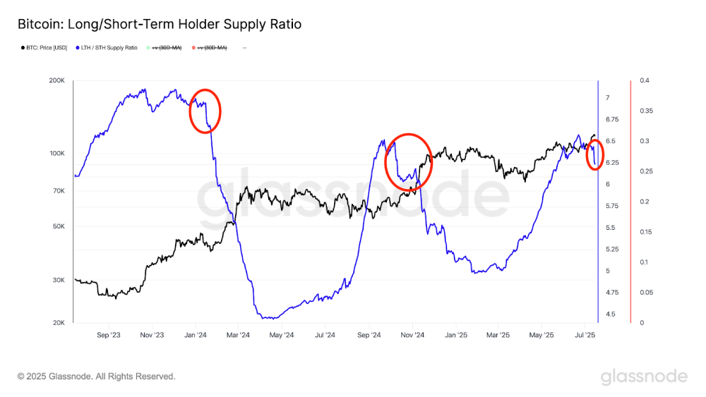 7. 问:长期/短期持有者供应比率是什么,它当前显示什么趋势?