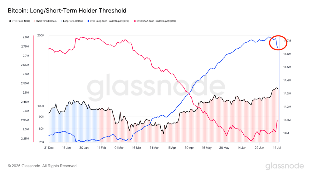 链上数据清楚地显示了这一趋势。从7月14日开始的一天内,大约有13,000枚比特币被转移到各大交易所,这个数字相当可观。更令人惊讶的是,从7月13日开始的两天内,长期持有者手中的比特币总量减少了近75,000枚,这说明很多人在高位选择了获利了结。