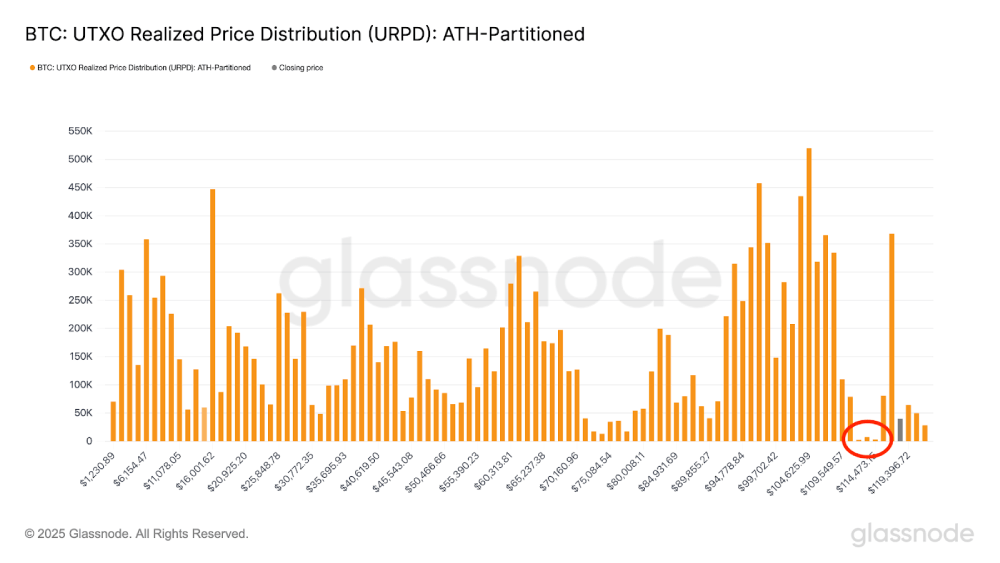 如果比特币价格继续下跌,我们可以通过链上数据来寻找可能的支撑位。未实现盈亏分布(URPD)指标显示,在112,000美元至115,000美元这个价格区间,累积的比特币仓位明显较少,形成了一个所谓的"真空区"。