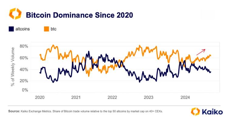 在市值占比上,比特币始终处于领先地位,主导率常年维持在40%至50%之间,反映出其在投资者心中的核心地位与市场共识。