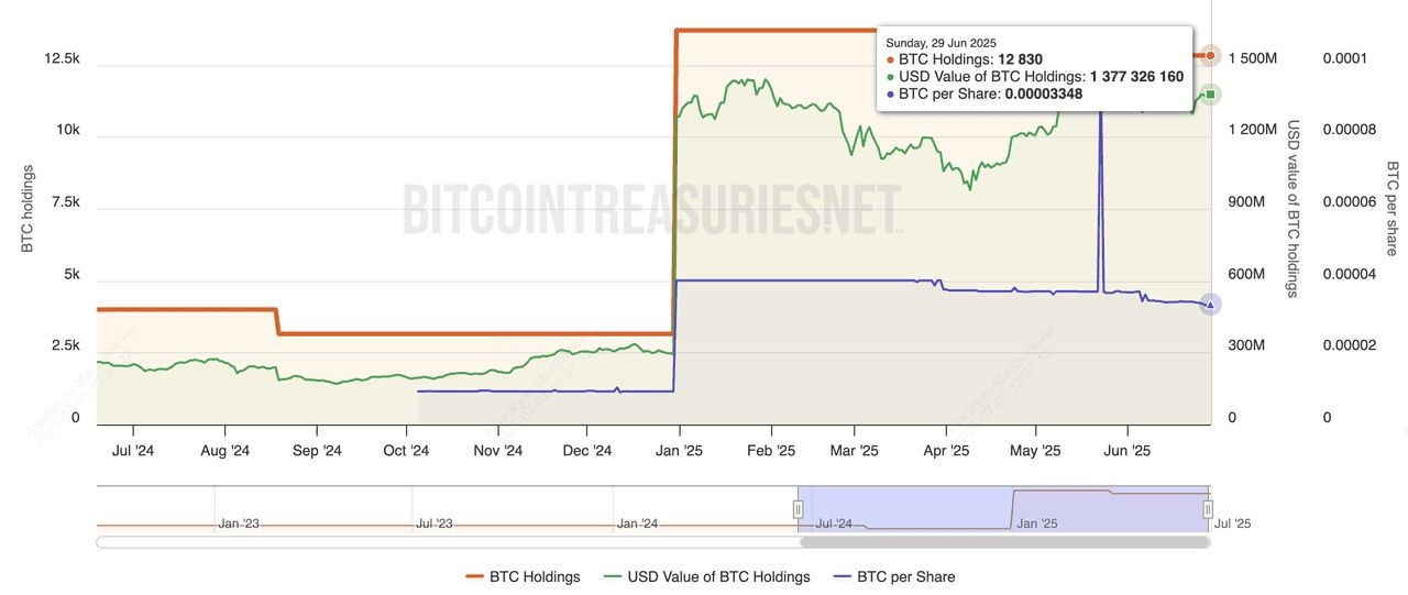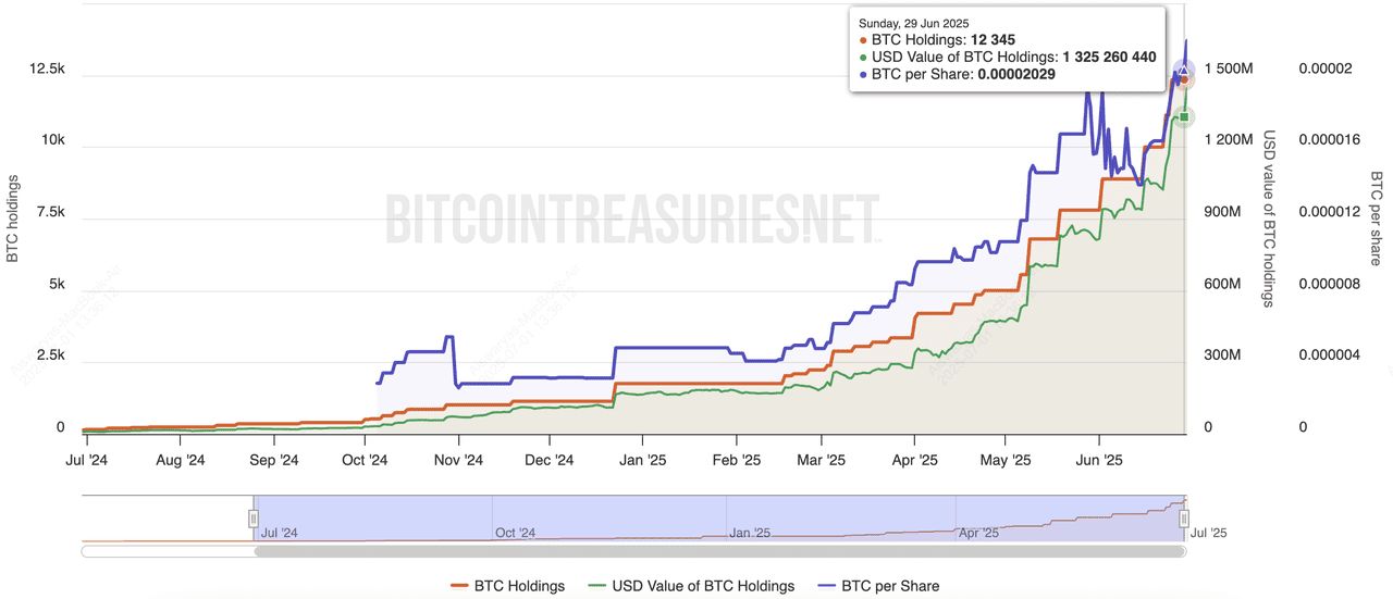 Metaplanet是一家在东京上市的公司,常被称为"亚洲策略",因其专注于比特币的转型。该公司自2024年开始积累比特币,截至2025年中期,持有13,350 BTC。最初是一家酒店业公司,Metaplanet已经重新品牌化,专注于数位资产,甚至开设了日本首家比特币主题酒店。其国库增长主要通过股票发行和直接购买BTC来实现,该公司计划在年底前将持有量再增长10,000 BTC。