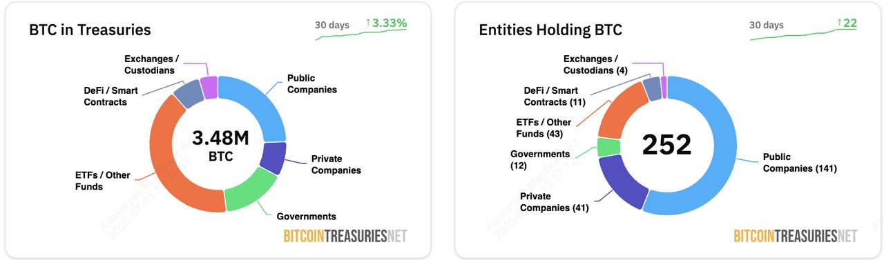 到2025年,持有比特币的公司数量急剧增长。截至2025年7月,超过140家上市公司将比特币纳入其企业库存,相较于五年前仅有几家。根据Bitcoin Treasuries的最新数据,这些公司共同拥有大约3.3%至4.1%的比特币总量。