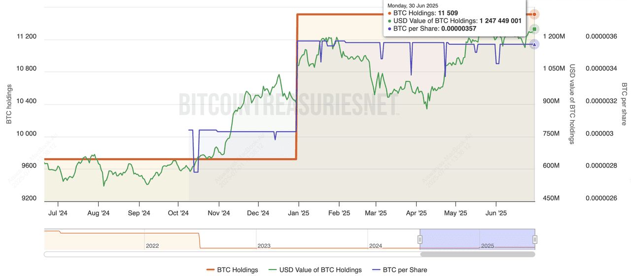 XXI(以CEP为交易代码)是一家较不为人知的美国公开上市公司,迅速在比特币国库排名中上升。仅仅一年多的时间,该公司就积累了37,230 BTC,主要通过战略性债务发行和在2024年第四季度及2025年初的积极购买。尽管该公司的核心业务仍在企业服务领域,但其转向以比特币为主的国库使其估值有所上升,尽管一些分析师指出,由于其市值相对较小,与持有量相比,存在流动性问题。