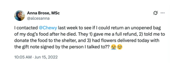早期的执行过程井然有序,并且以客户为中心。 Chewy 的客服团队不仅处理订单,还会寄送手写的节日贺卡,为忠实客户定制宠物肖像,并在心爱的宠物去世时送上鲜花。这些服务需要花钱,而且难以规模化推广。以下是一条广为流传的推文: