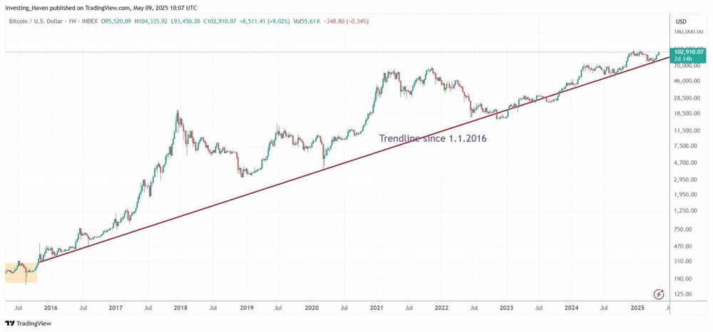 2013年,比特币在减半后上涨了约10倍;2017年,涨幅约为20倍;2021年,涨幅约为6倍。从2022年15,600美元的低点计算,如果上涨6倍,周期顶部将位于约93,600美元——这个价格已经被突破。如果上涨10倍,则意味着价格将达到156,000美元。