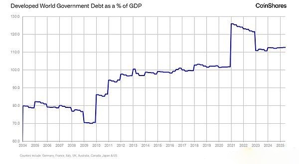 在主权债务不断上升的世界中(美国债务占GDP的115%),比特币提供了一种非主权替代方案,不受违约风险或量化宽松政策影响。