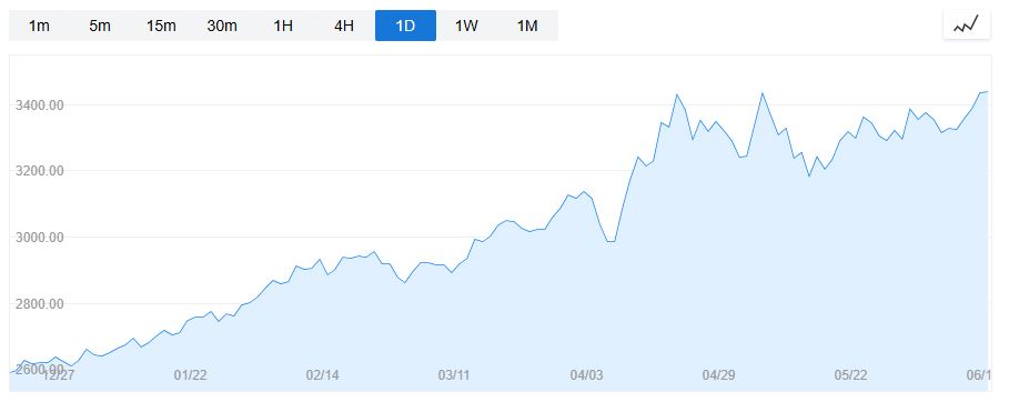 金价则是另一番景象,呈现稳定且持续的震荡上涨趋势,目前价格维持在3,450美元/盎司附近,最近还创下了今年的新高。