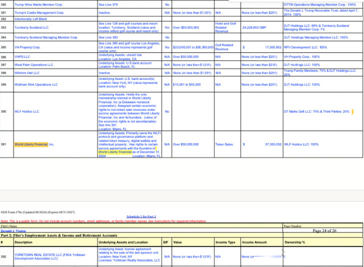 就在同一时间,纽约邮报拿到了美国政府道德办公室的财务文件,上面显示特朗普个人去年从家族关联的加密货币平台World Liberty Financial赚了5735万美元,这成了他最重要的收入来源之一。