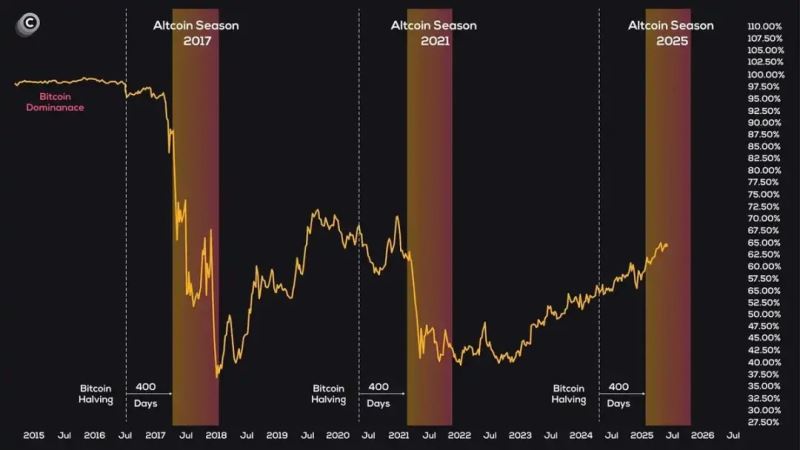 山寨币季节会在比特币主导权明确回落后开始,而不是在周期高位盘整时。