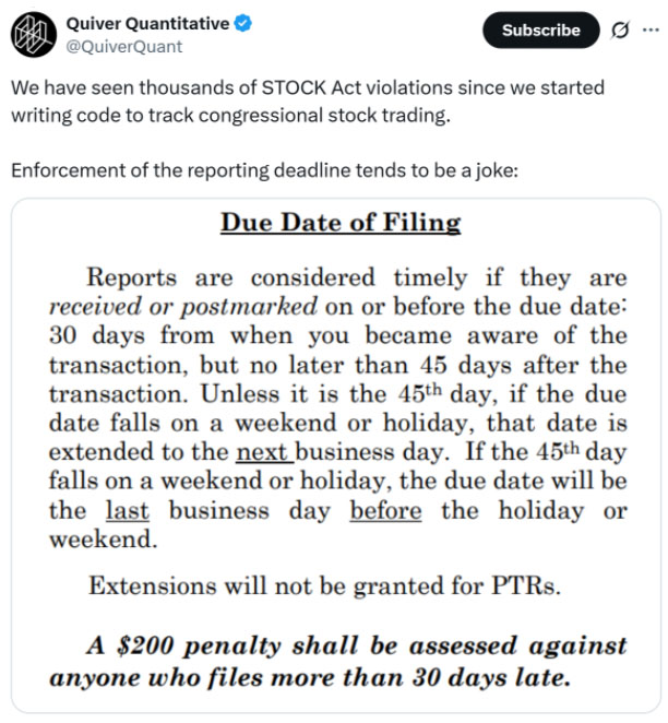 "自从我们开始编写代码追踪国会股票交易行为以来,我们已经发现了数千起违反《股票法案》的事件,"Quiver Quantitative补充说。