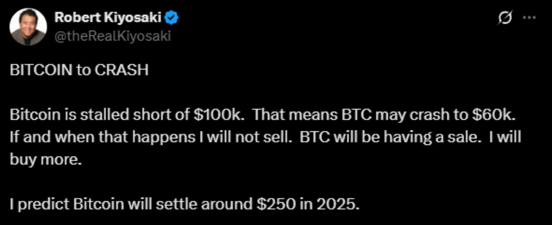 《富爸爸穷爸爸》的作者罗伯特·清崎也对比特币的未来持乐观态度。虽然他提醒说,考虑到目前比特币在10万美元以下面临一些阻力,价格可能会暂时回调到6万美元左右,但他认为这反而是买入的好机会,而不是恐慌的时候。