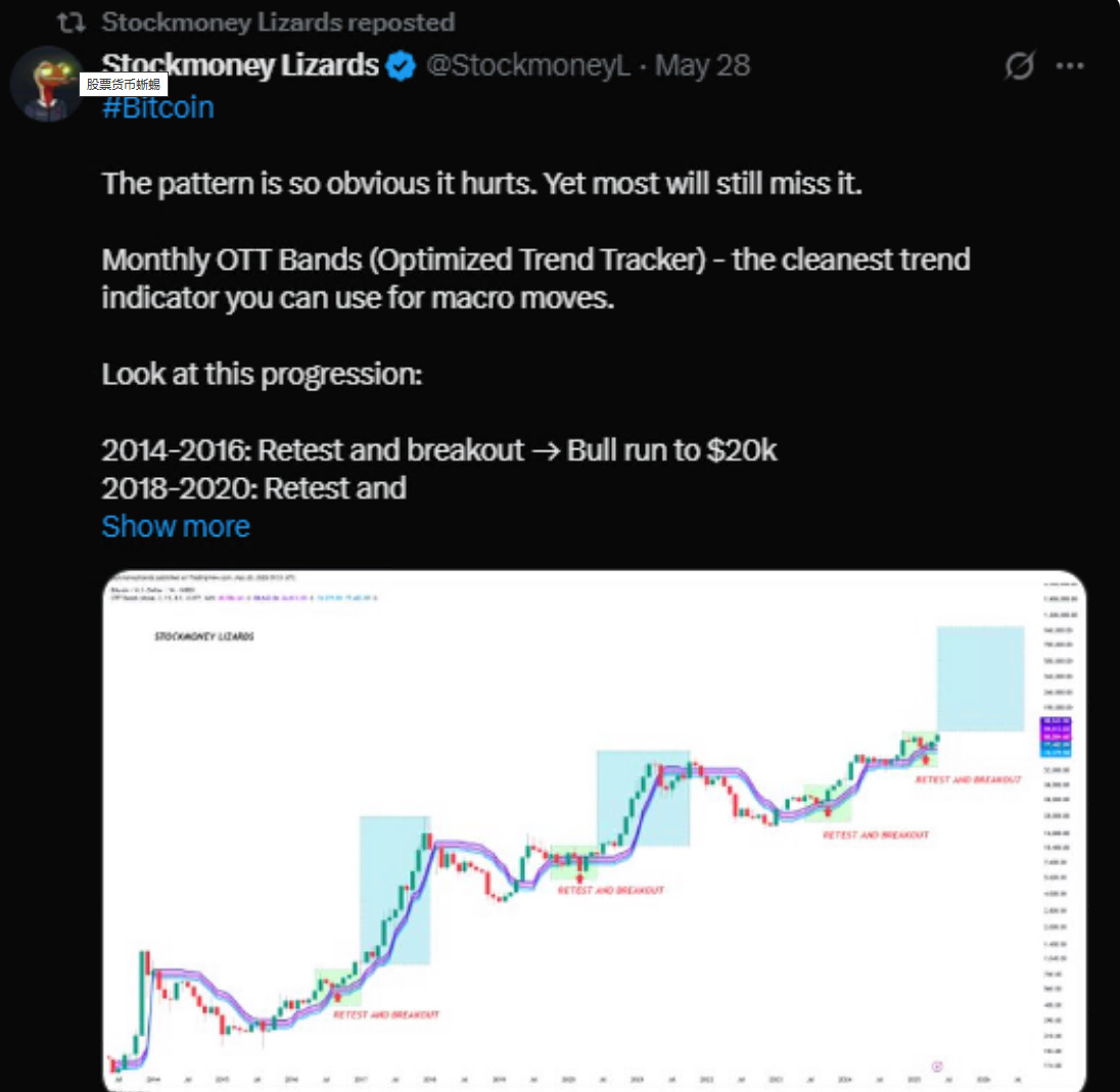 知名加密货币分析机构Stockmoney Lizards最近分享了一张很有意思的图表,这张图表基于每月OTT波段(优化趋势追踪器),展示了比特币正处于"重新测试和突破"的关键阶段。有趣的是,这种模式在过去几次出现时,都预示着比特币即将迎来一波大牛市。回想一下,2014年到2016年的一次突破后,比特币价格一路飙升至2万美元;而2018年到2020年间的类似突破,则将比特币推高到了6.9万美元的历史高点。现在,在2022-2024年这个时间窗口里,同样的突破信号再次出现——分析师们认为,这很可能意味着下一轮大牛市真的要来了。