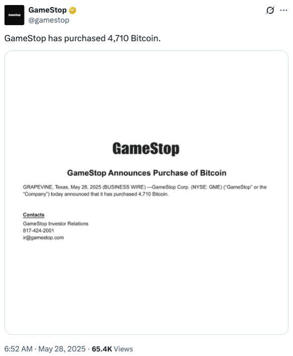 美国视频游戏和消费电子零售商GameStop在5月28日通过其X账户发布的声明中确认了首次比特币投资,购入了4710枚比特币(BTC)。