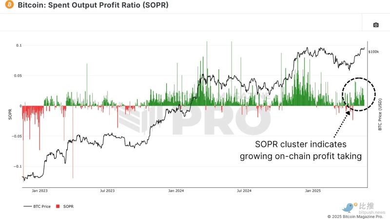 已花出产出利润率(SOPR)这个指标能让我们实时看到整个网络上的利润实现情况。观察最近几周的数据,可以明显发现利润实现的趋势在上升。那些绿色的柱状图聚集在一起,清楚地告诉我们,确实有不少投资者正在出售比特币来锁定利润,尤其是在价格从74,000-75,000美元区间一路攀升至超过10万美元的新高之后。