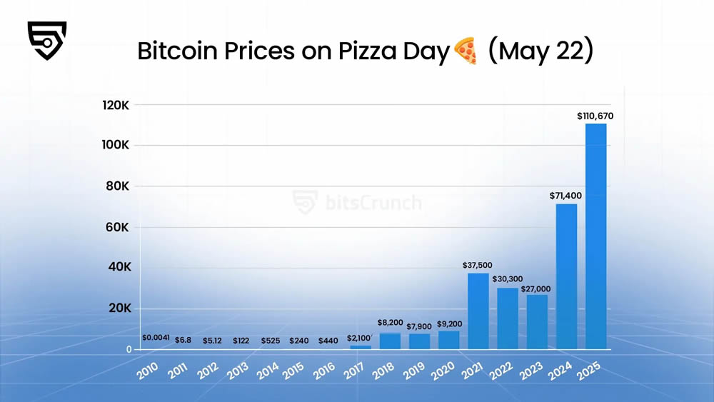 从0.0041美元到现在的11万美元,通过查看每年5月22日的比特币价格数据,我们可以清楚地看到它发展过程中的关键阶段和背后的推动因素。下图是比特币在历年披萨节的价格表现。