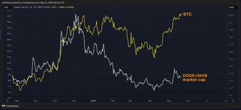 从历史来看,比特币的阶段性行情顶部(包括去年12月到今年1月)通常都会伴随着市场的高度投机情绪,这种情绪往往会推高像DOGE和SHIB这类"非严肃"代币的市值。