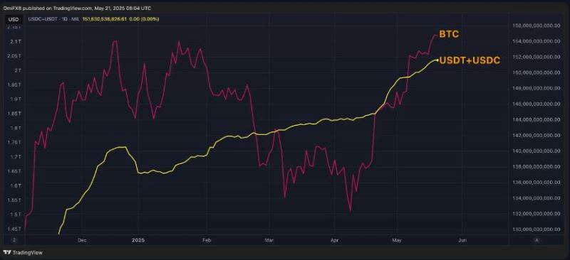 两大美元稳定币——USDT和USDC的总市值已经达到了创纪录的1510亿美元。根据TradingView的数据,这比去年12月到今年1月的平均市值(1390亿美元)高出近9%。
