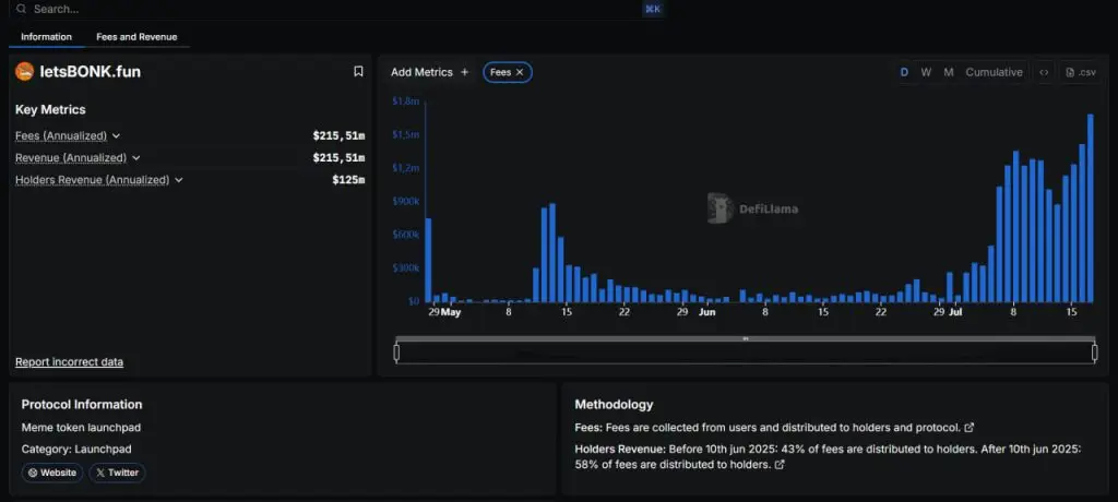 DeFiLlama的增长图表显示,自2025年7月初以来,平台的每日交易费用急剧上升,有些日子甚至达到近180万美元/天。这清晰展现了memecoin浪潮的火热,以及letsBONK.fun在Solana社区越来越受欢迎。用户和新代币的快速增长,把平台的交易量和收入推到了前所未有的高点。