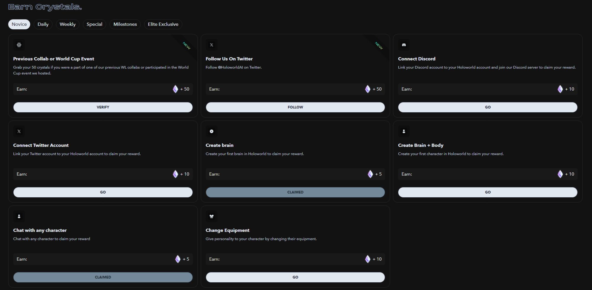 用户可通过完成各种类型的任务来获得 Crystals,如:社交媒体任务、与不同角色对话、参与合作项目交互以及好友邀请等,精英用户还拥有独家任务。据官方介绍,Crystals 是 Holoworld 中的一种独特货币,可以在未来拥有诸多好处,比如解锁与特殊角色的独家对话,并作为商城中的货币来获取角色装备等数字资产。目前,Holoworld 还内设了一个 Crystals 持有数量排行榜,每周更新一次。