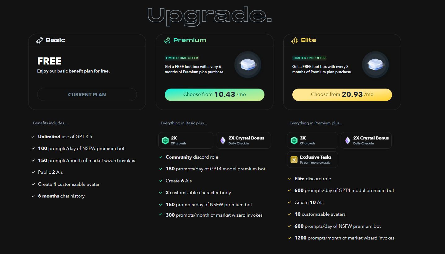会员等级不同,在平台功能访问、生态参与度以及奖励数量上也会有所差异。比如,付费会员可以创建的 AI 角色数量更多,在奖励数量上倍数增长,又比如在创建 AI 角色时,付费用户可以解锁更多功能,如角色扮演伴侣和市场向导功能等。