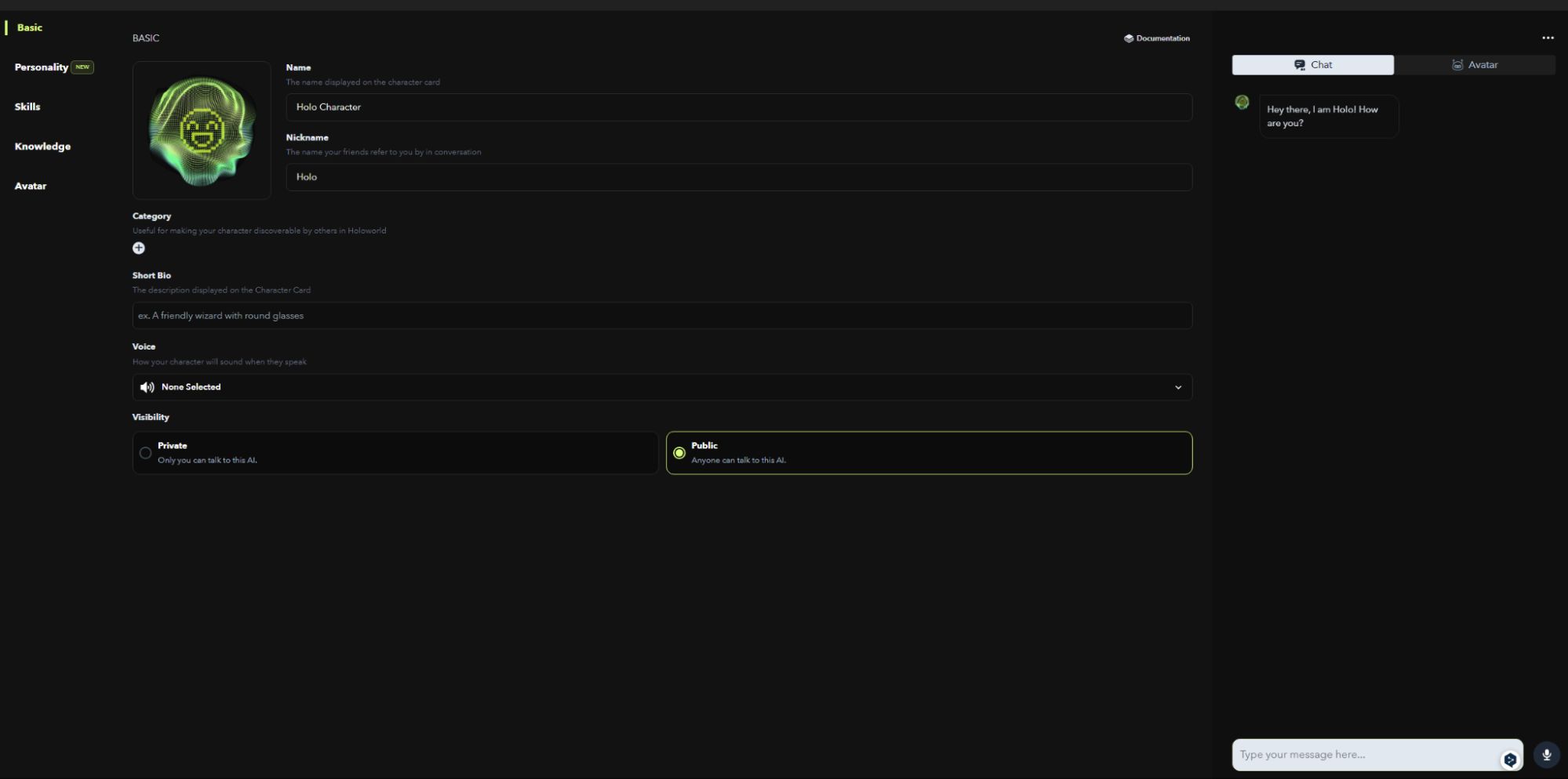 Holoworld 现阶段的核心功能是创建 AI 角色,用户进入创建页面后,根据要求分别完成 AI 角色的基础信息、个性属性、技能、知识等内容,并通过 3D 模块自定义角色化身,包括服装、设备等。值得一提的是,为了让角色更加饱满和生动,用户可以选择声音音色,也可以通过上传链接 URL 或者文档来进一步训练角色,保持其个性化和自主化成长。
