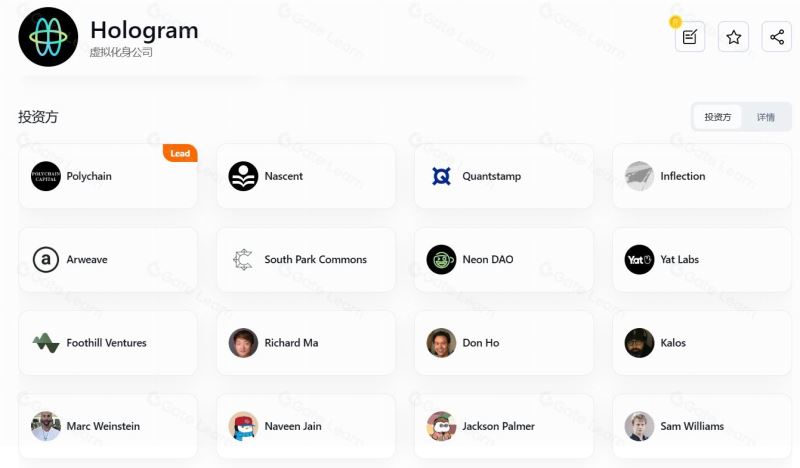 2022 年 7 月,Hologram 完成了由 Polychain 领投的 650 万美元种子轮融资,Nascent、Arweave、Inflection、Quantstamp、Neon DAO、Foothill Ventures、Yat Labs、South Park Commons 等机构,以及 Marc Weinstein(Mechanism Capital 合伙人)、Sam Williams(Arweave 创始人)、Kalos( Parallel 联合创始人)、Richard Ma(Quantstamp CEO)、Mike Shinoda(Linkin Park 成员)等天使投资人参投。