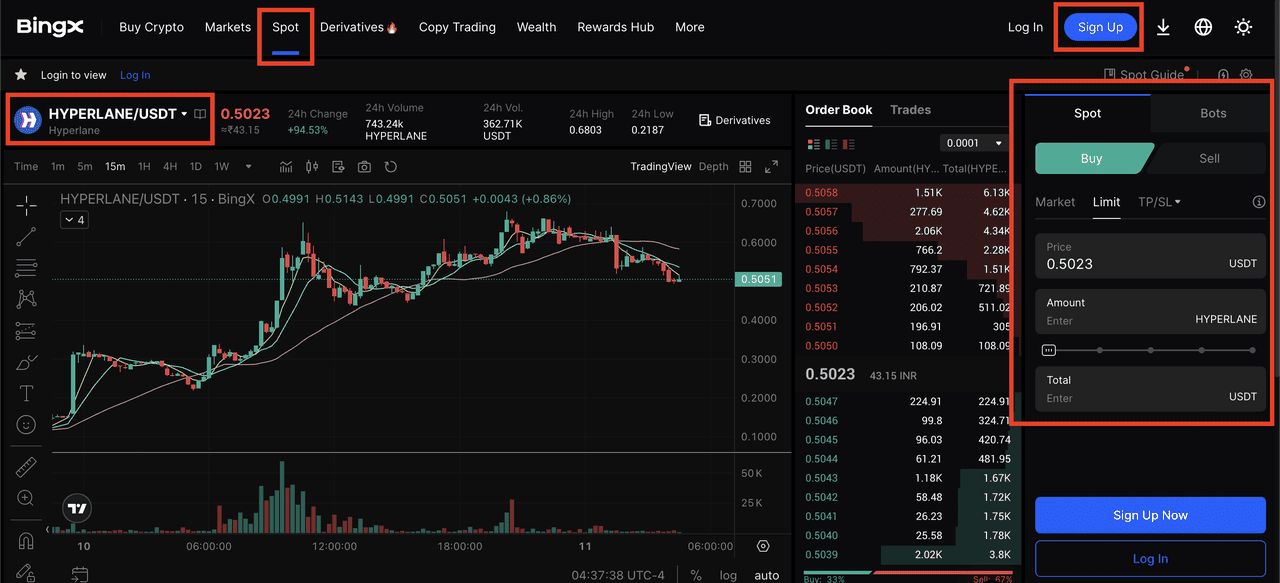 在支持的交易所如BingX上购买HYPER代币,为您的自主管理钱包提供资金,并确保它与以太坊或BSC兼容。访问BingX现货市场,搜索HYPERLANE/USDT交易对,并下达市价或限价单来获得HYPER代币。