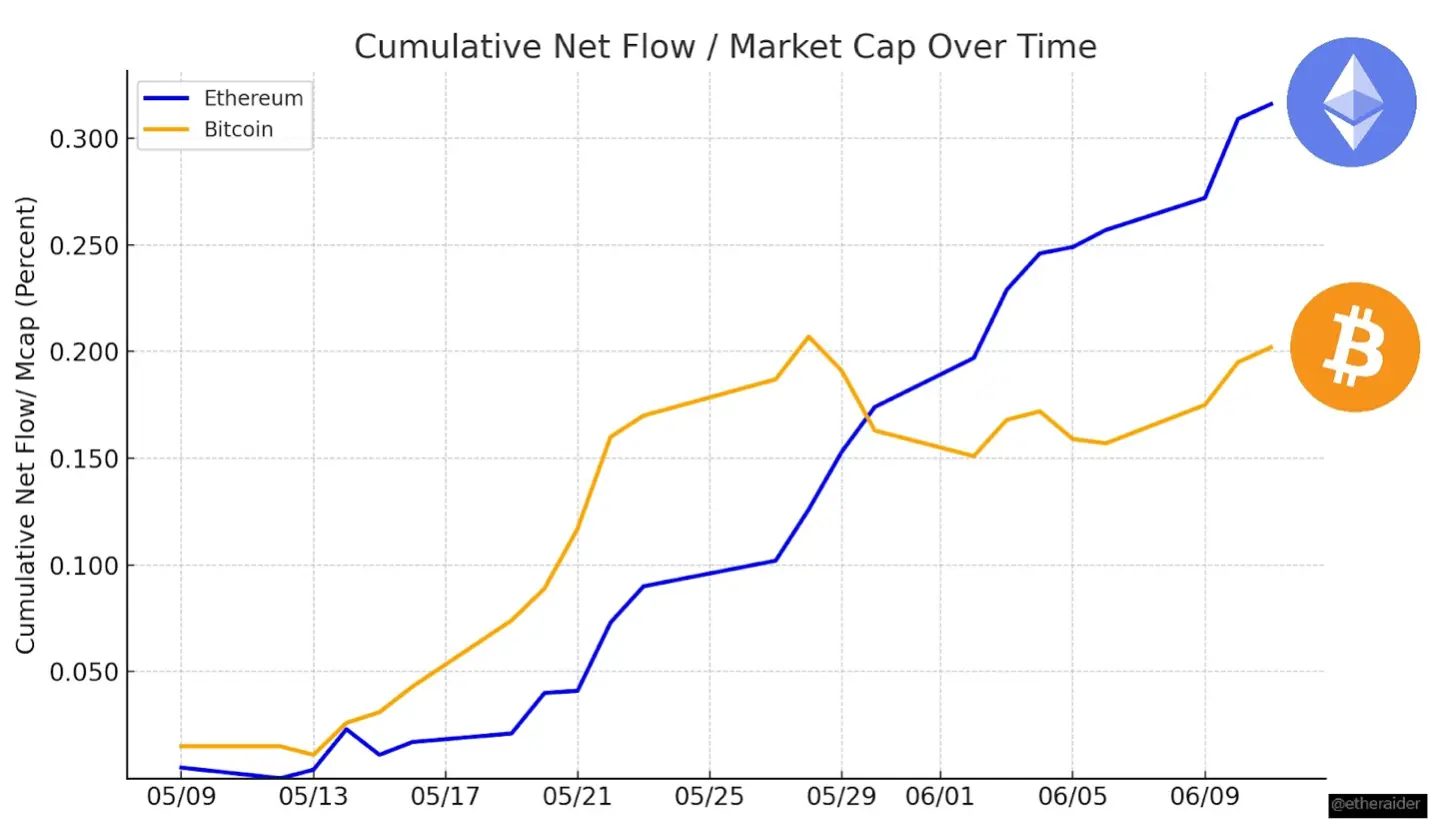 截至2025年6月12日,以太坊现货ETF已连续19个交易日录得正向资金流入,打破加密ETF历史上的连续净流入记录;其中,6月11日单日净流入高达2.4亿美元,不仅远超比特币ETF同期的1.65亿美元,更凸显了市场对ETH的偏好正在增强。