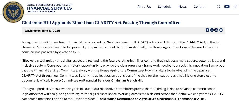 《CLARITY法案》率先由众议院推进。2025年6月13日,该法案已分别在金融服务委员会和农业委员会以32:19与47:6的表决结果获得通过。目前,法案已进入规则委员会流程,等待安排提交至众议院全体会议进行表决。