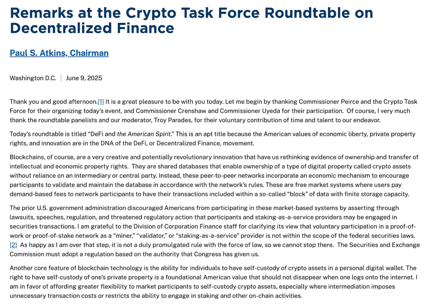 Atkins已经撤回了Gensler时代针对去中心化金融和自我托管的提案,转而采取"创新优先"的策略。在最近的一次圆桌会议上,Atkins甚至强调开发者不应该因为编写去中心化代码而受到惩罚。