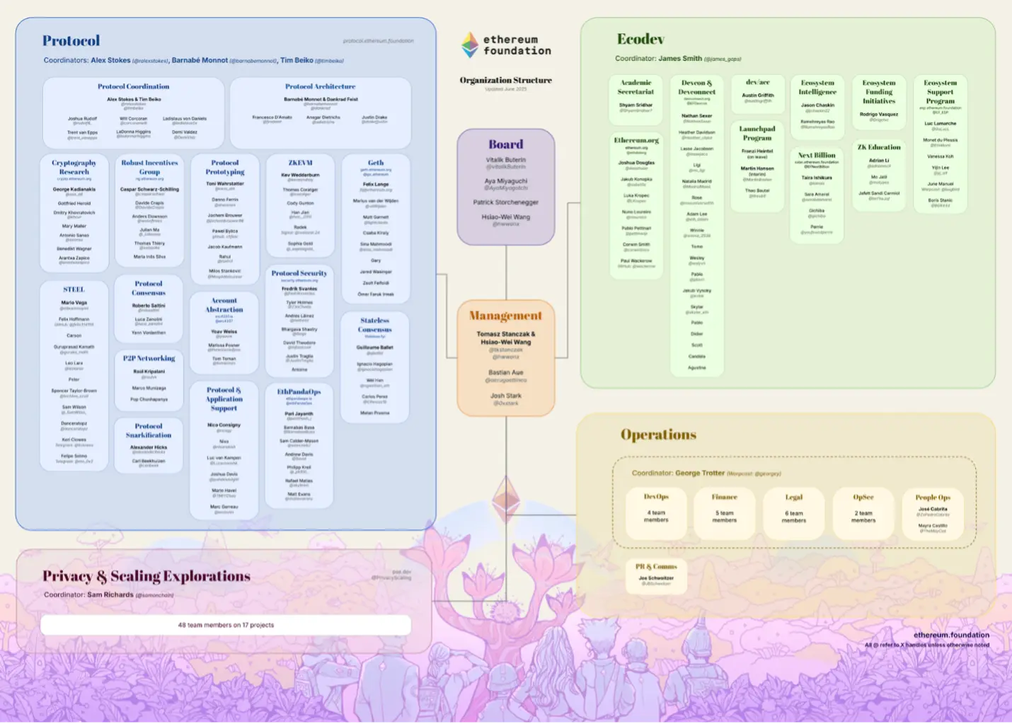 2025年,以太坊基金会(EF)发布了新的组织架构。原执行董事Aya Miyaguchi升任President,专注全球战略与外部关系;董事会则由Vitalik Buterin、Aya Miyaguchi、瑞士法律顾问Patrick Storchenegger及新晋董事Hsiao-Wei Wang组成,负责长期愿景与合规监督。