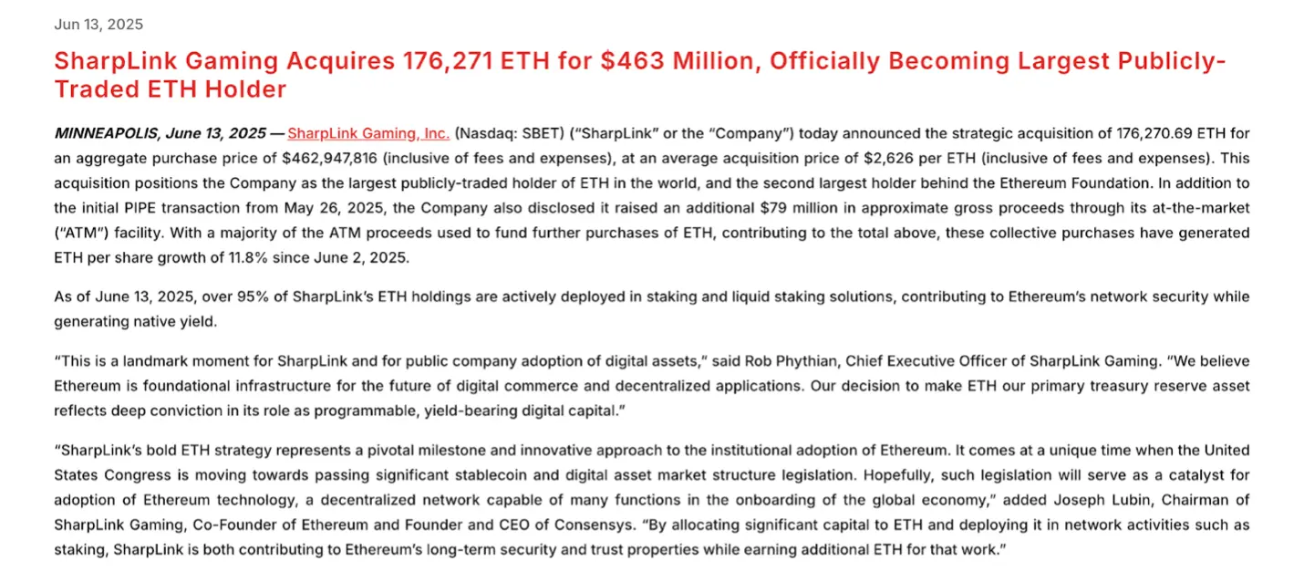 越来越多的大资金玩家正将Ethereum视为战略资产,这一趋势因SharpLink Gaming的一项引人注目的举措而加速。纳斯达克上市公司SharpLink最近完成了一笔具有里程碑意义的资金配置:收购了176,000枚ETH(约4.63亿美元),将以太坊作为其主要储备资产,一夜之间成为全球最大的公开ETH持有者。目前,这笔资产中超过95%已投入质押,以赚取收益并增强以太坊网络的安全性。