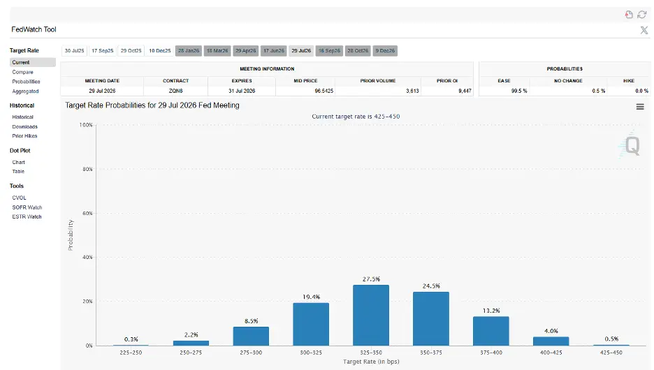 根据CME Fed Watch预测,到2026年中期,联邦基金利率将降至3.25%或更低。与此同时,Ethereum链上质押收益率(目前约为3.5%年化利率)有望因网络活动和手续费的增加而上升。