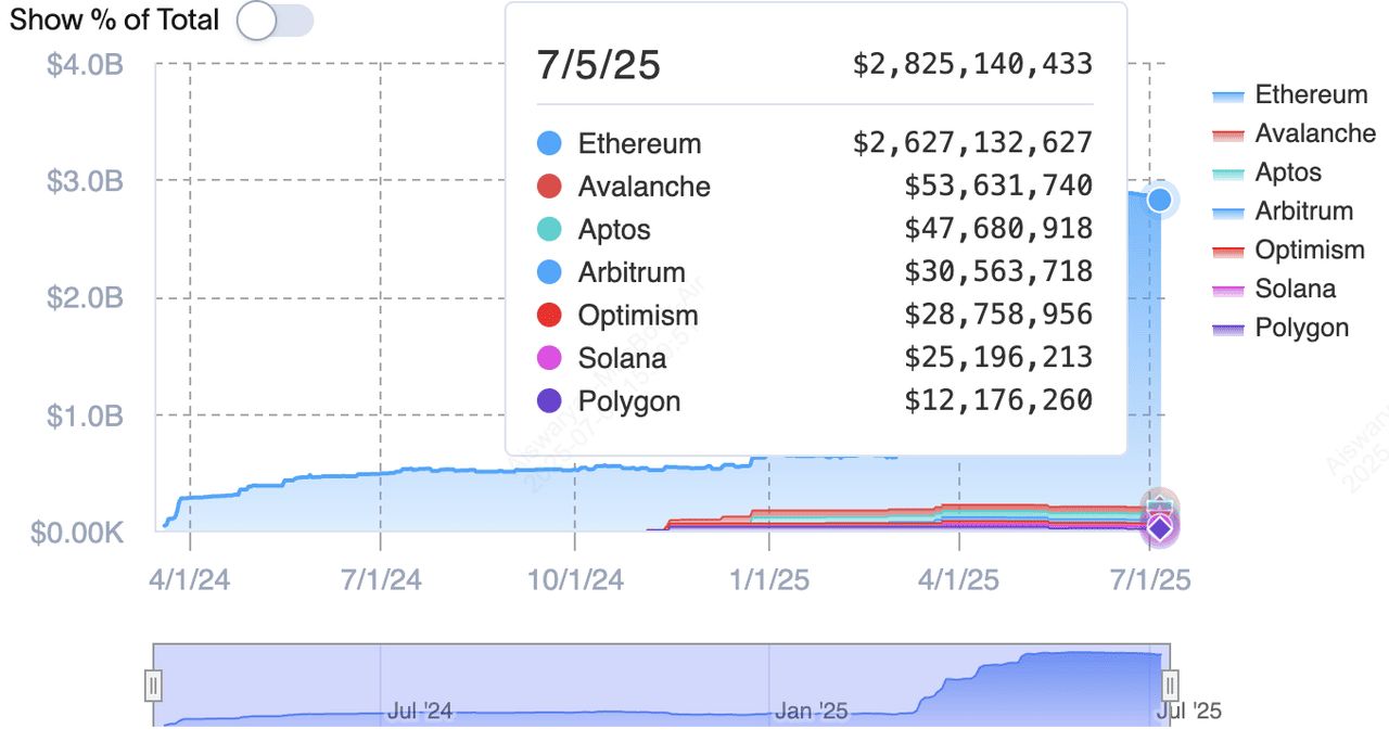以太坊生态系统也通过Layer-2解决方案如Optimism、Arbitrum和ZKsync Era扩展,提供更快速的交易和显著降低的费用,同时保持以太坊的安全保证。Ondo Finance,一个崛起中的RWA代币化玩家,利用以太坊及其Layer-2基础设施,已将美国国债和公司债代币化,使链上投资者能高效地获得收益型现实世界资产。此外,像Securitize和Ethena所构建的专用Layer-2网络正在被设计专门为机构需求服务,结合DeFi可组合性和许可型合规功能。这种分层方法使得以太坊成为一个非常灵活且值得信赖的中心,既适合零售也适合机构RWA活动。