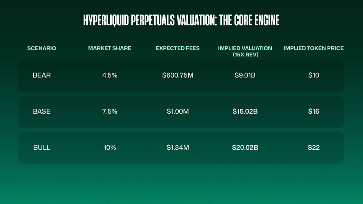 这些数字基于15倍的市盈率计算,与dYdX或Vertex等同类DEX(市盈率在30-150倍之间)相比,这个倍数相当保守。即使只占据较小的市场份额,Hyperliquid的代币仅从这一业务领域来看,也足以支撑其两位数的估值。