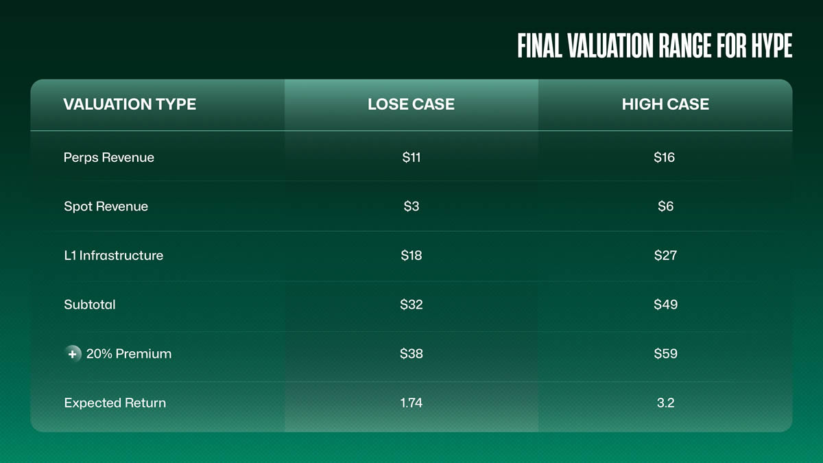 - 通过分部总和估值模型分析,HYPE代币的合理价格区间为38美元(低溢价情景)到59美元(20%溢价的牛市情景)。