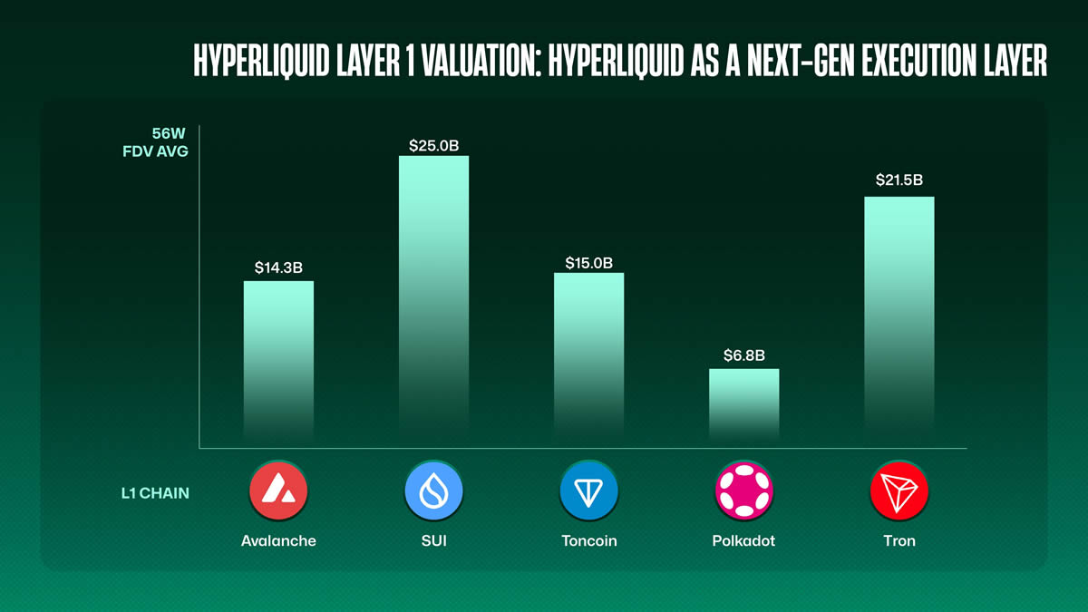 这些L1链的FDV加权平均值约为165亿美元,这为Hyperliquid的Layer1平台(假设流通供应量约为9.2亿)提供了18-27美元的单价基础。这还不包括生态系统激励、协议收益分成以及潜在的现实世界应用集成等额外价值因素。