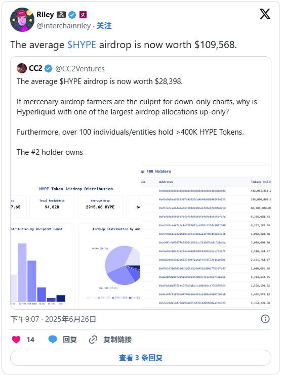 重要的是,Hyperliquid发行的HYPE代币没有风险投资分配。2024年的空投将31%的供应量分配给用户,而38.8%则预留用于发行。这种设计消除了风险投资过剩,并促进了社区的有机增长。