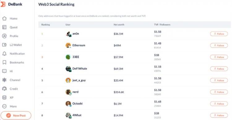 答:用户可以访问DeBank官网,点击"More"进入"Web3 Social Ranking",筛选目标账户,查看其当前参与的空投项目。通过观察与自身投资风格契合的空投者及协议,可以发现潜在的空投机会,这种方法比在X平台浏览热点话题更有价值。