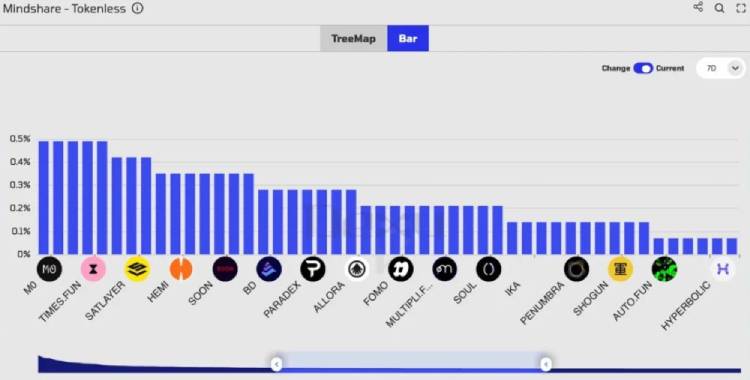 值得关注的是,Kaito 提供免费数据看板,按「心智份额(Mindshare)」罗列头部非代币项目。尽管 Top 20 项目的截图频繁刷屏,但 Top 21-50 中的项目你能认出几个?